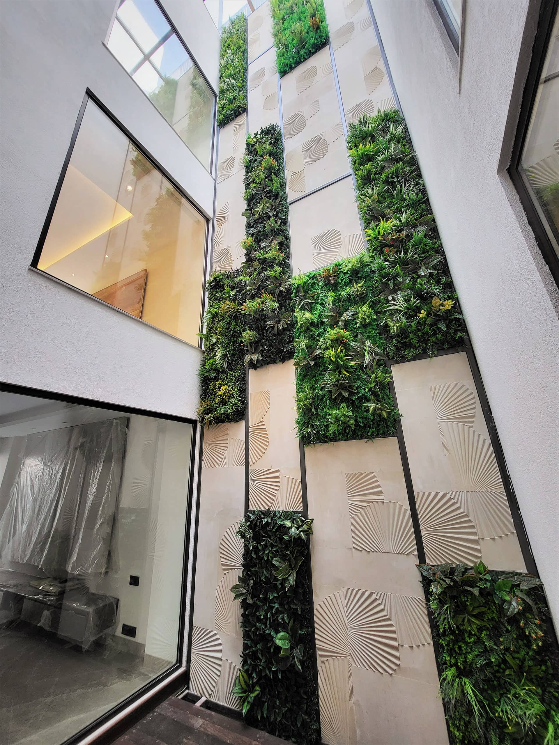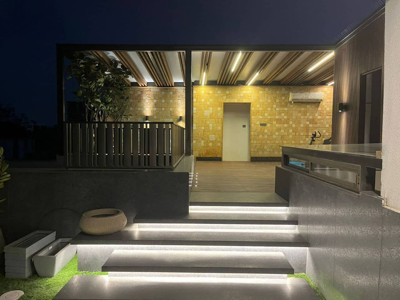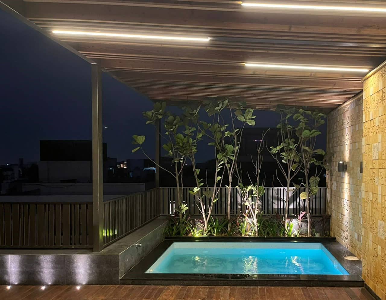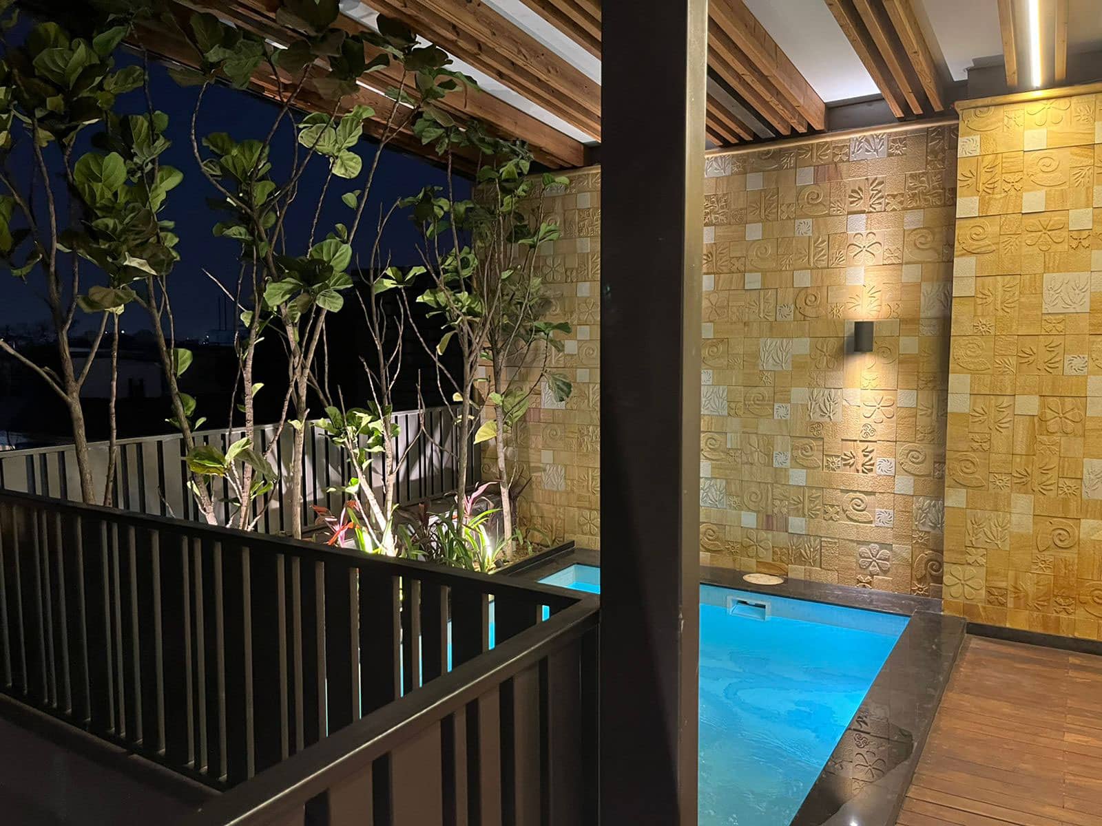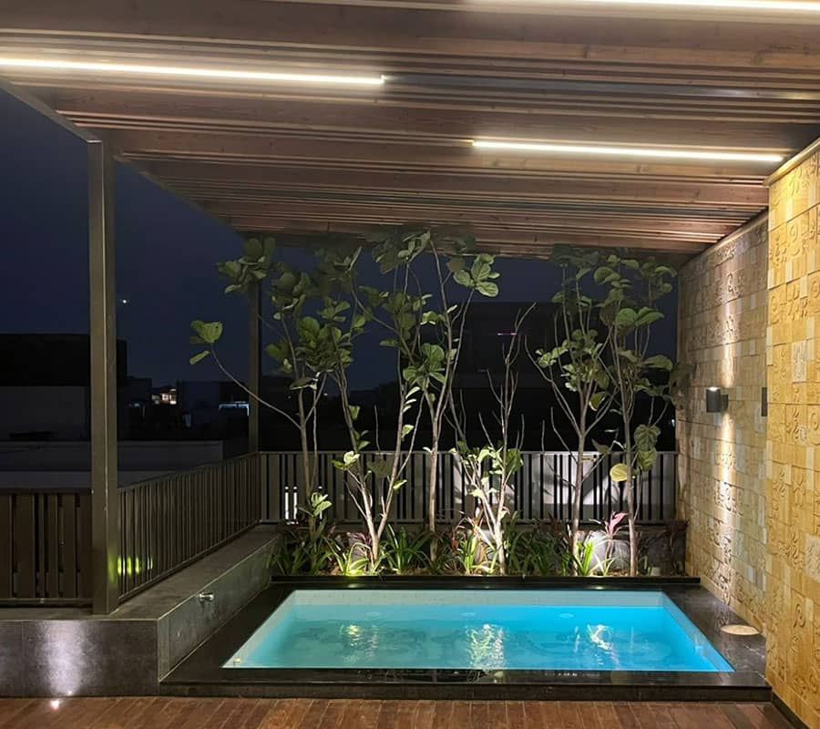 “The heart of this posh residence is its visual courtyard which is overlooked by most lobbies & bedrooms. The highlight of the central courtyard is the feature wall which is a combination of stone and green wall; breaking the verticality with interesting pattern giving a different view from each level. The terrace is adorned with lush green lawn and ornamental flowering plants surrounding the outdoor gym, pool, bar and outdoor covered sitting to destress oneself from day-long tiredness.”