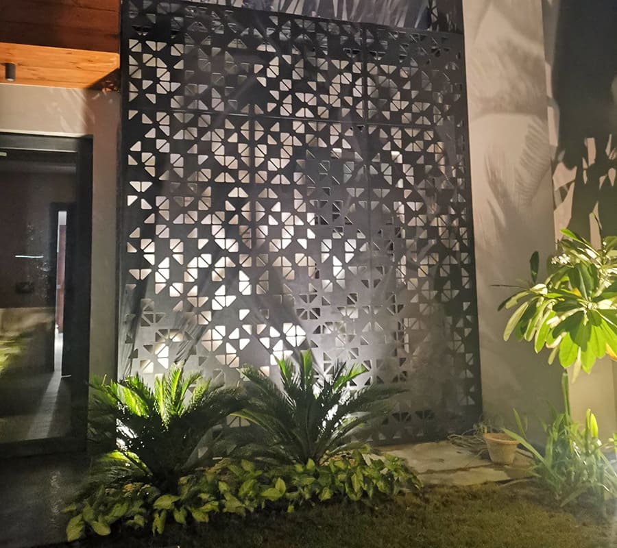 “The serene landscape has added tranquility to this contemporary residence. The key feature of this residence is the modern metal jaali which compliments the warm wooden & grey texture paints of the house. Ornamental plants such as different variety of Plumeria trees, Palms and other flowering plants has been added to enhance the solitary of the place.””