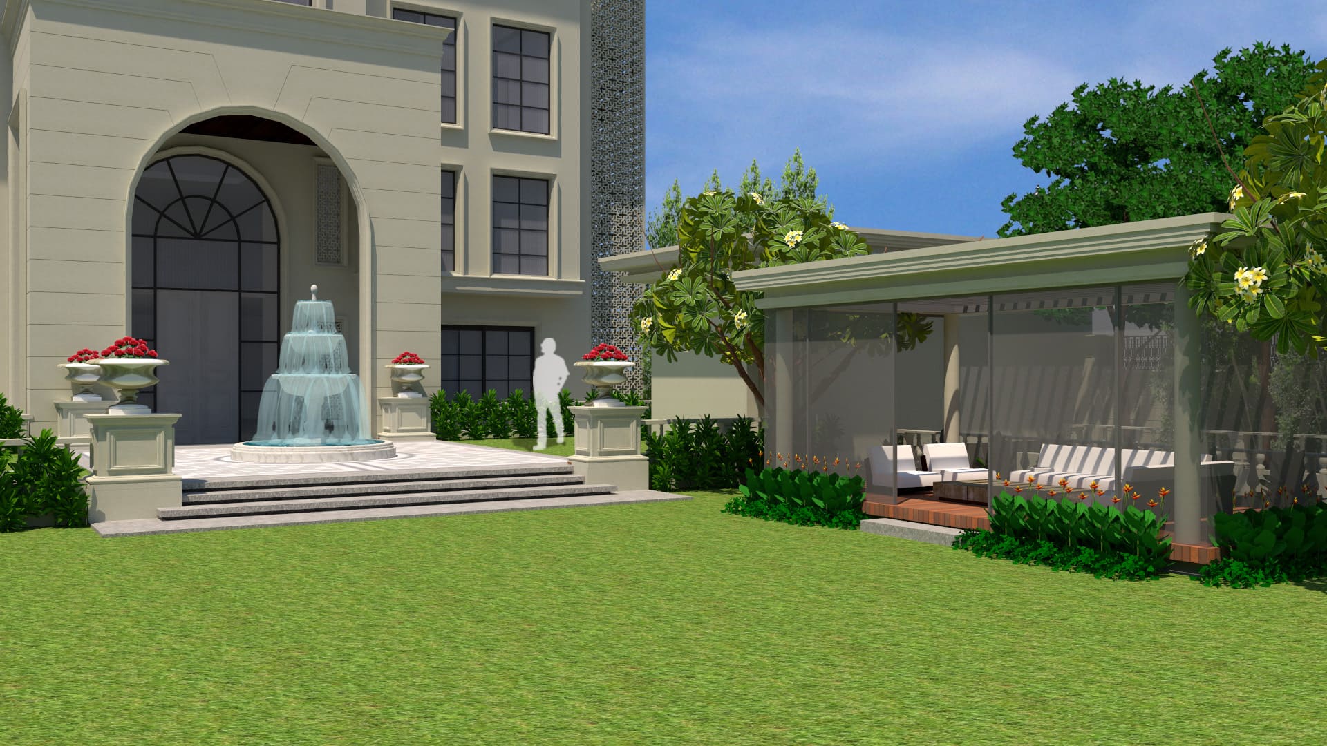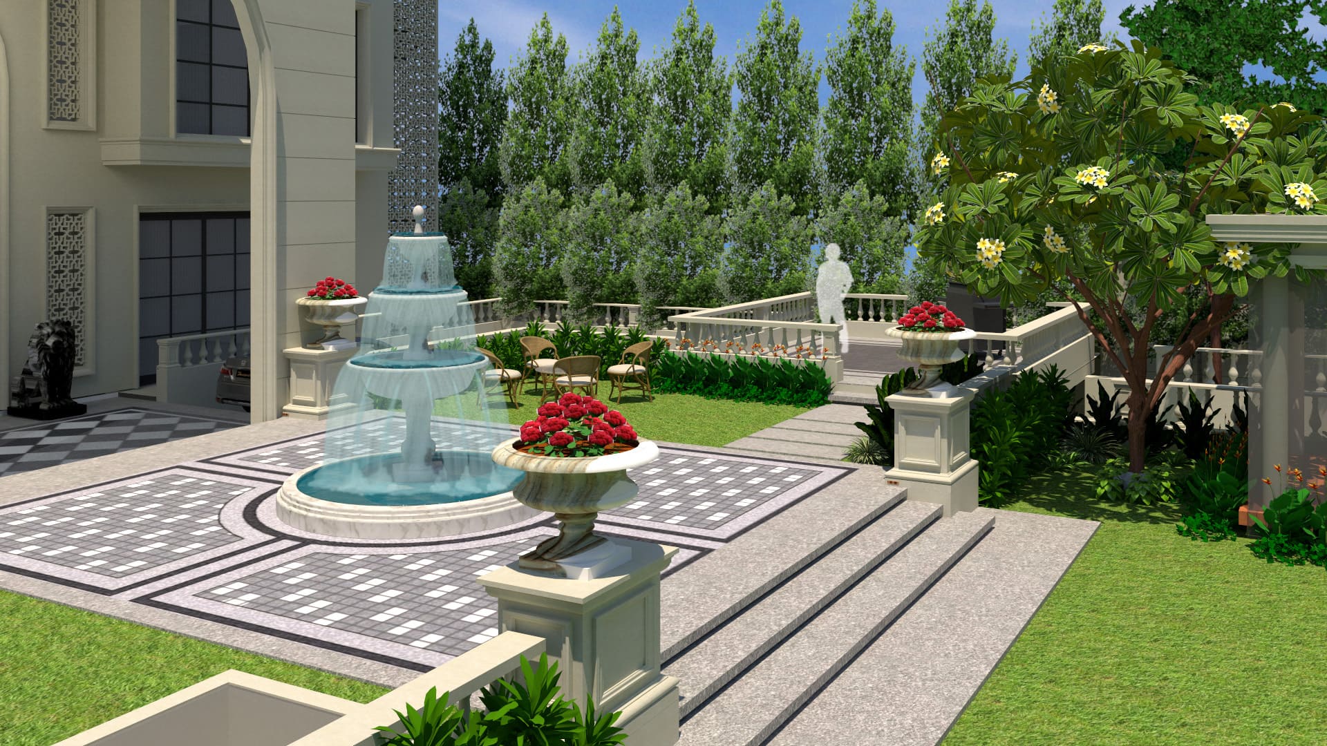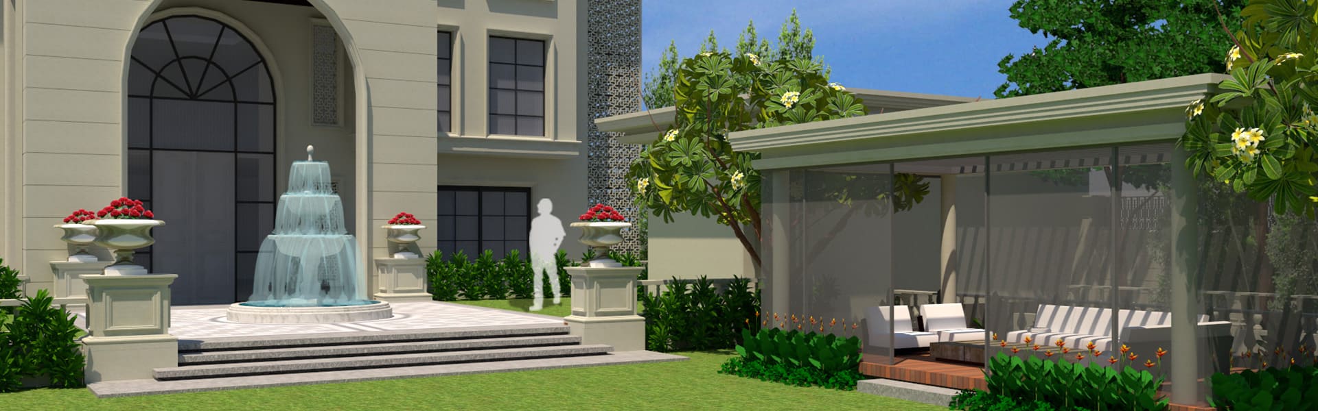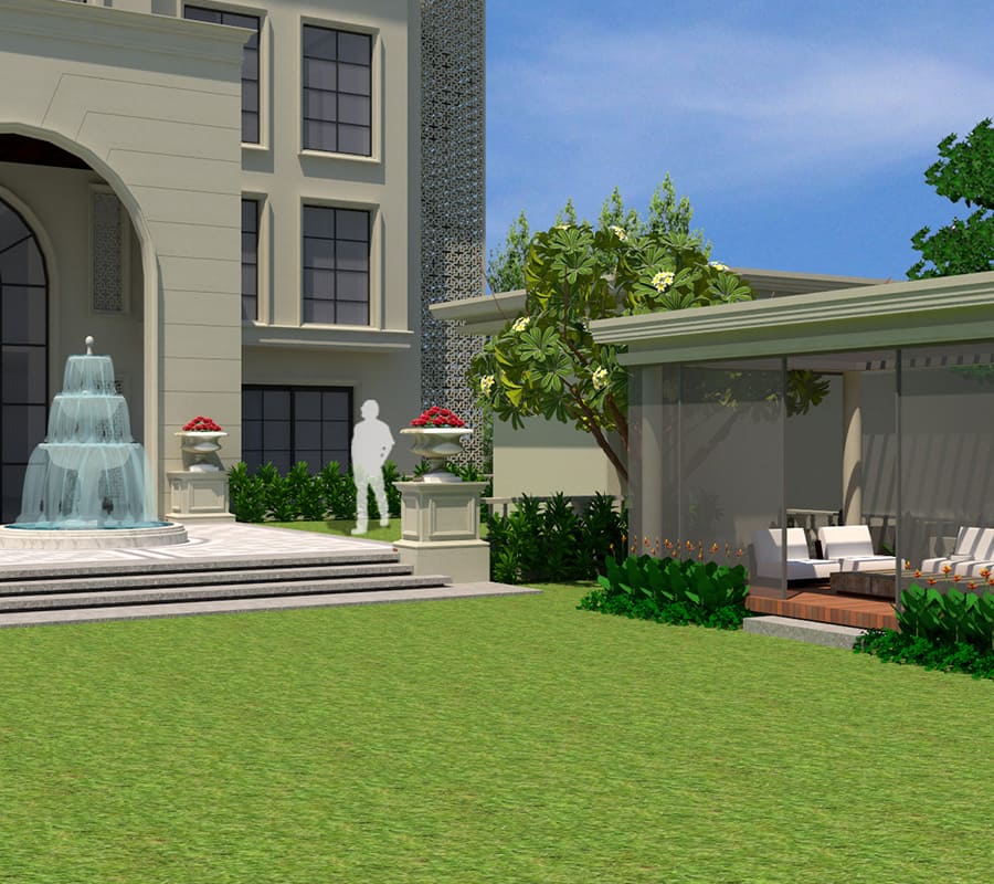 “The landscape design of this opulent residence reflects the classical theme of the building. A rigid geometry of straight lines and circles are used to design this immaculate classical style garden. Features such as tiered stone water fountain, decorative urns, stone railings, outdoor gazebo, lush lawn and alluring planting palette forms the highlights of this project.”