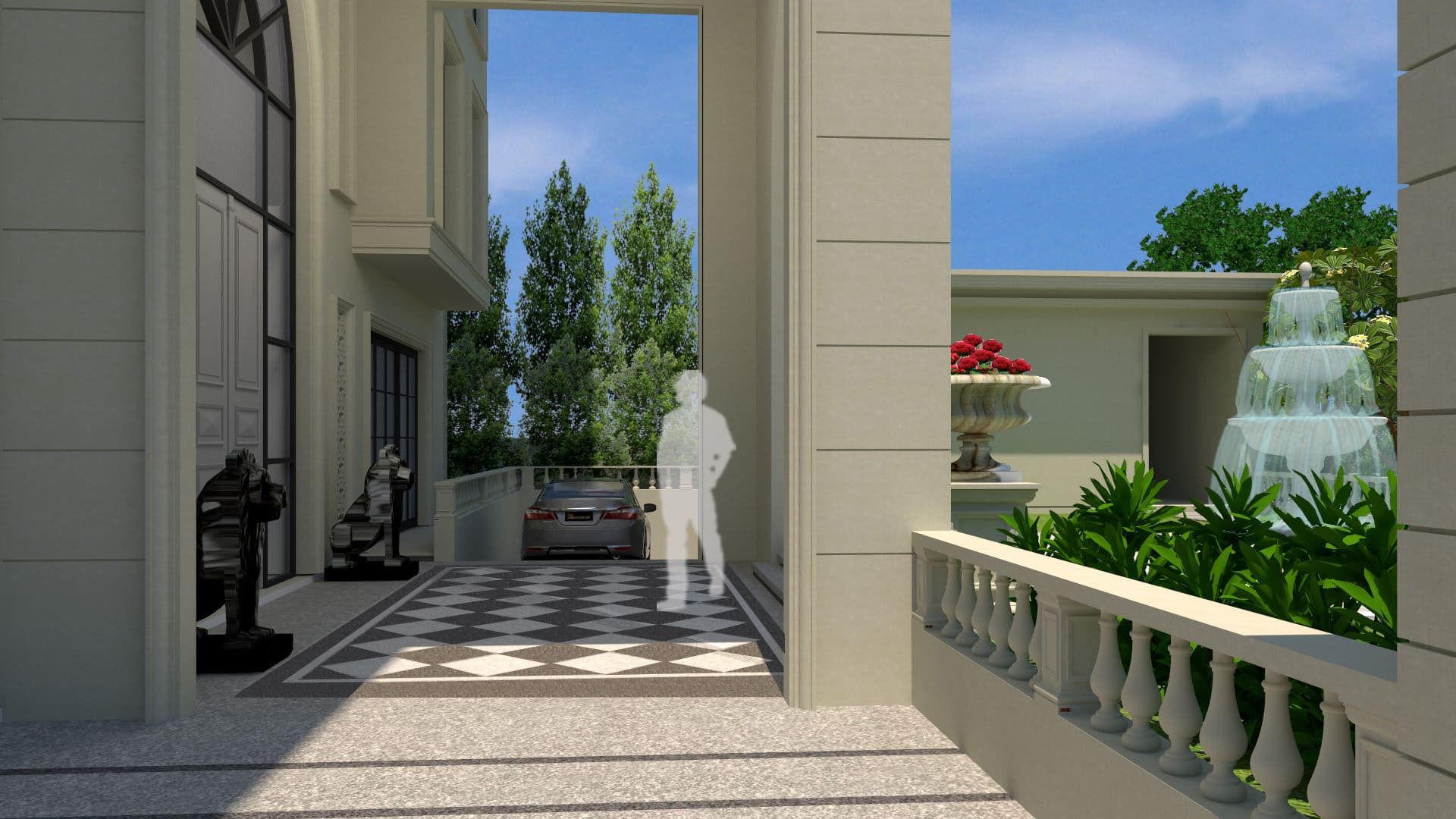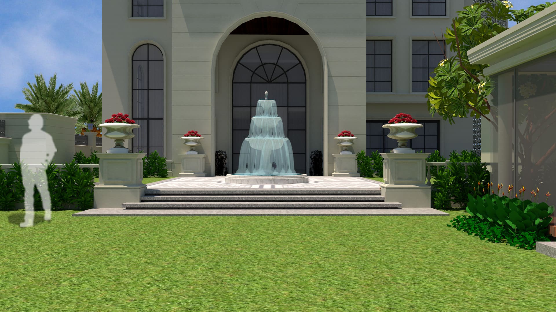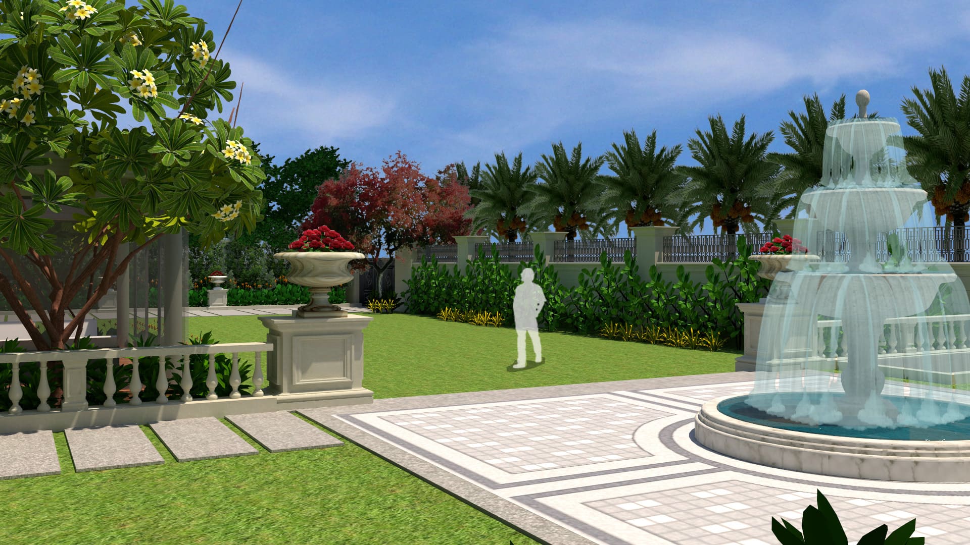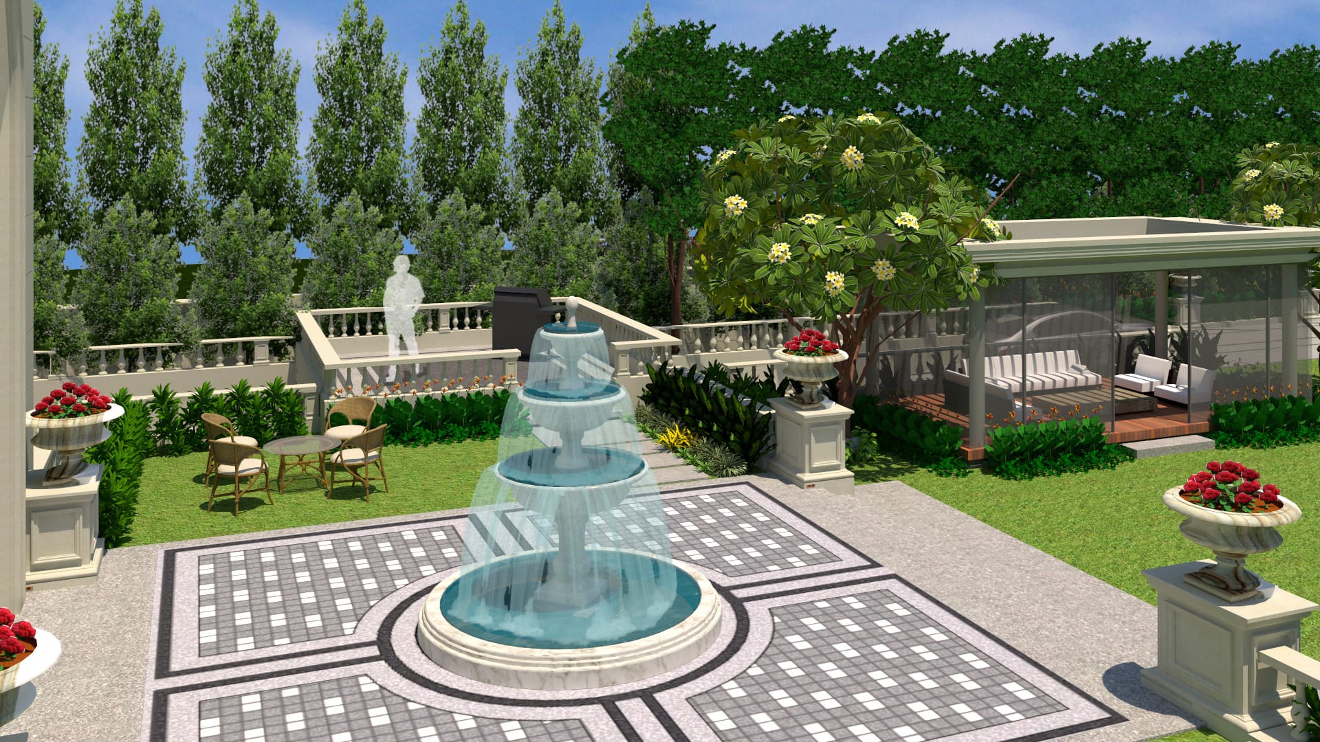 “The landscape design of this opulent residence reflects the classical theme of the building. A rigid geometry of straight lines and circles are used to design this immaculate classical style garden. Features such as tiered stone water fountain, decorative urns, stone railings, outdoor gazebo, lush lawn and alluring planting palette forms the highlights of this project.”