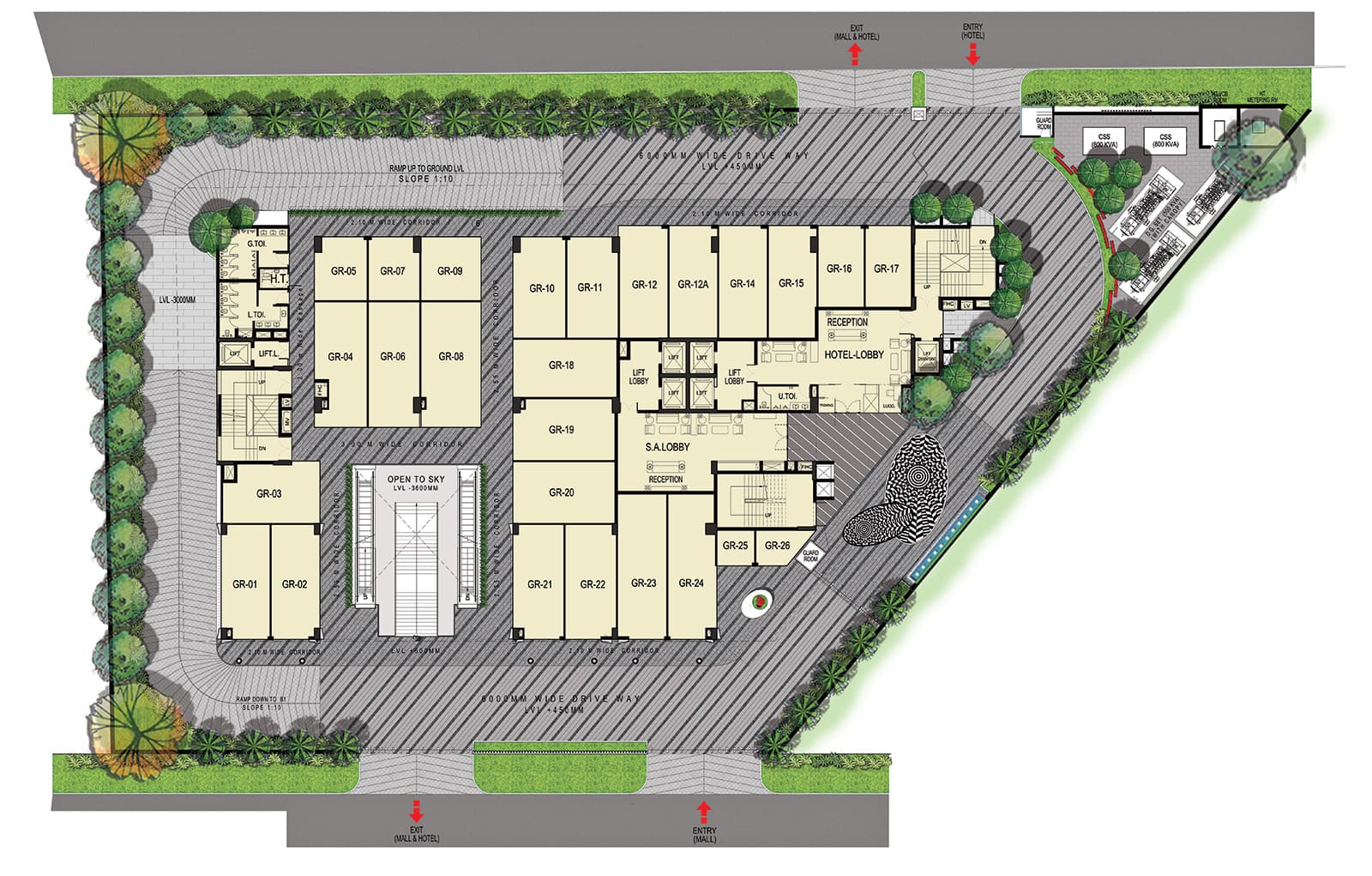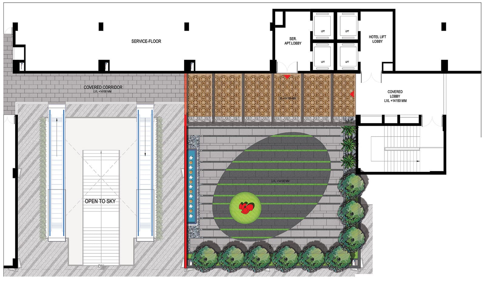 “A small cozy terrace emphasized by a water feature with jet nozzles backed by an accent wall. An abstract sculpture sits at the centre surrounded by ornamental plumeria (champa) trees with views to the city can gives you a feeling of warmth that not even a cup of coffee gives in winters.”