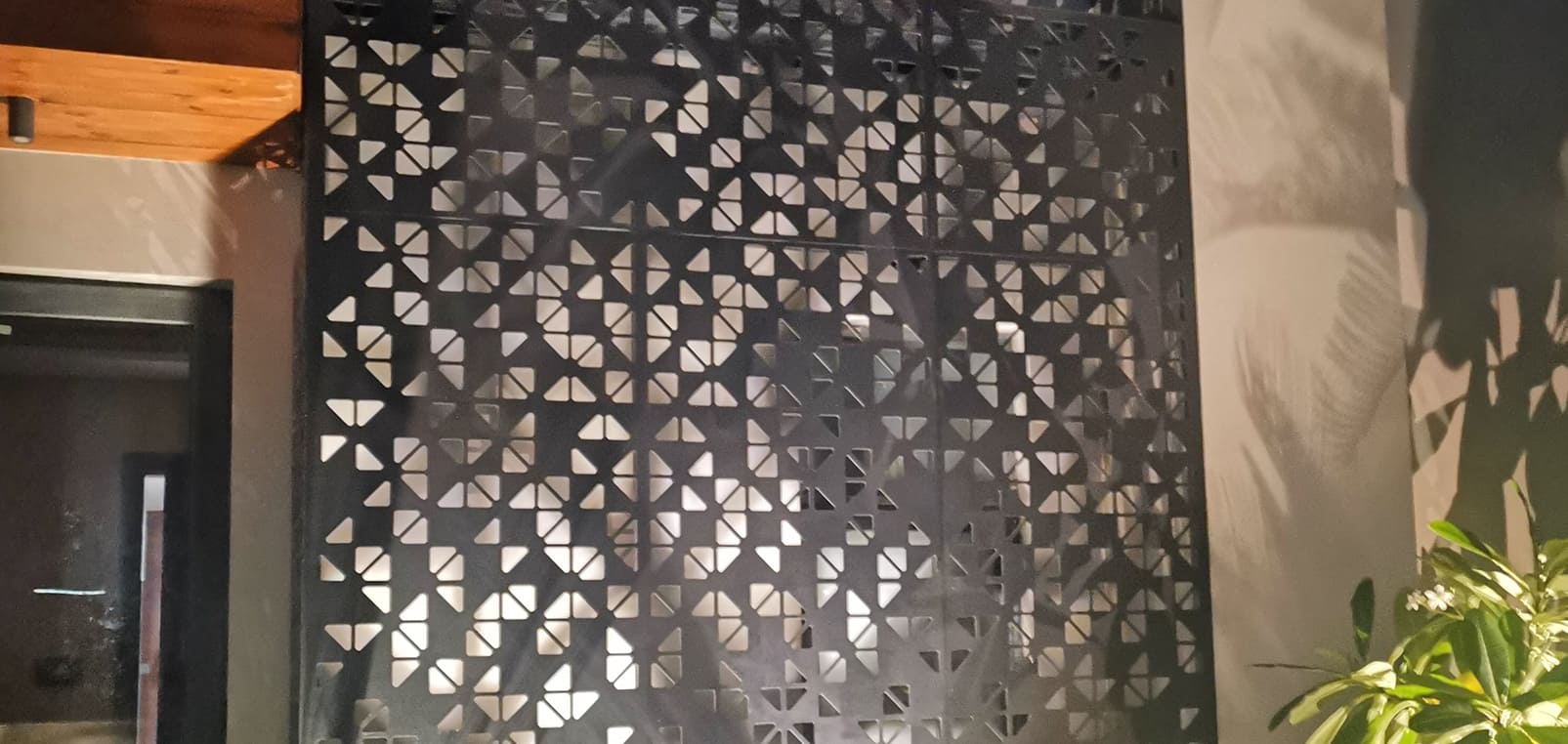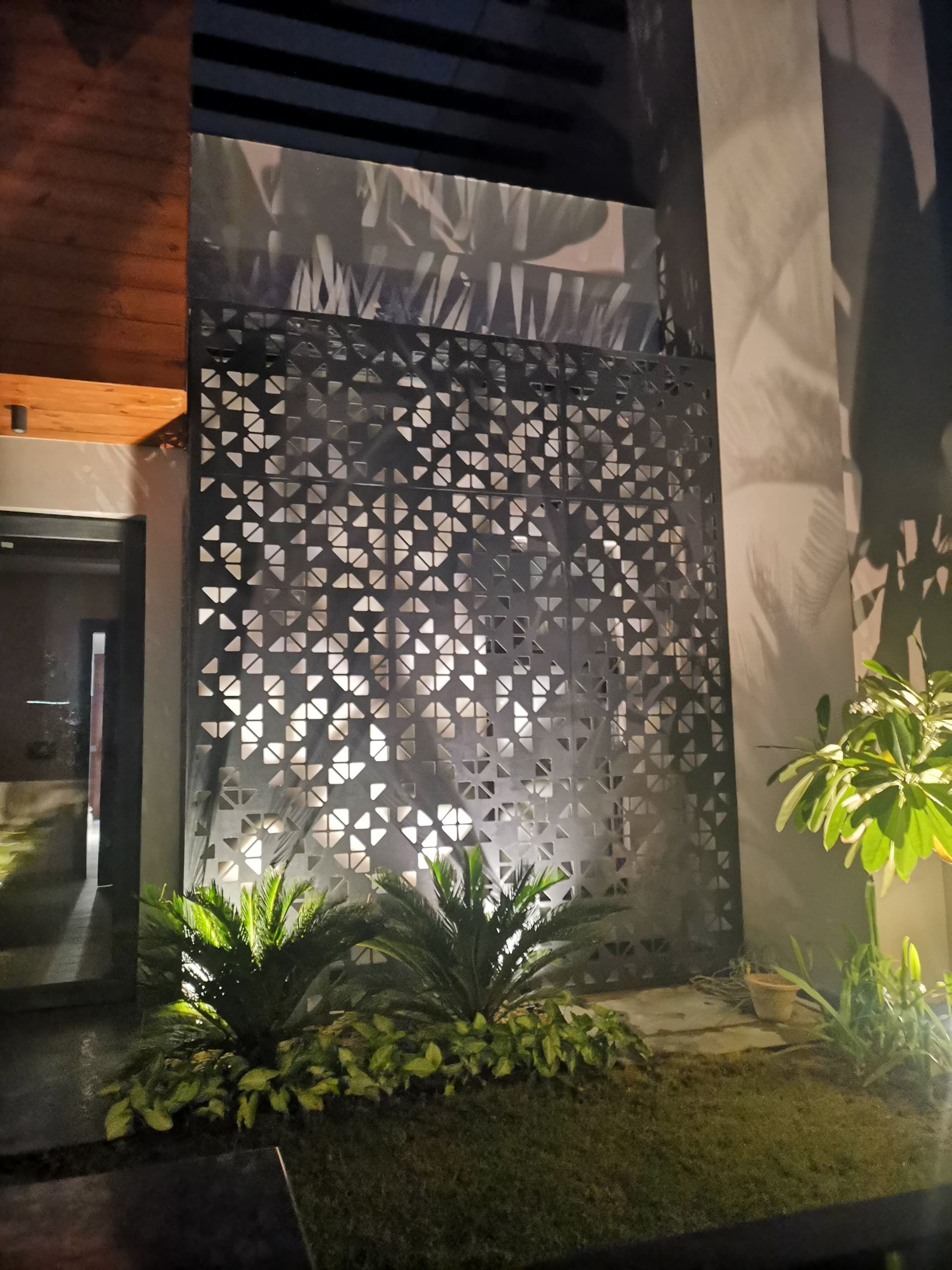 “The serene landscape has added tranquility to this contemporary residence. The key feature of this residence is the modern metal jaali which compliments the warm wooden & grey texture paints of the house. Ornamental plants such as different variety of Plumeria trees, Palms and other flowering plants has been added to enhance the solitary of the place.””