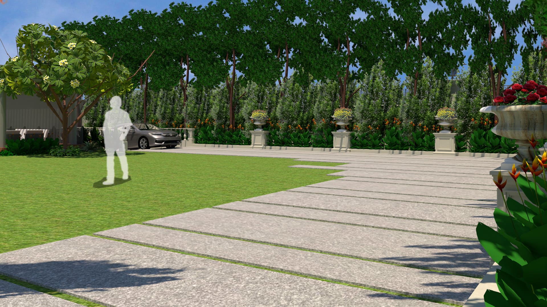 “The landscape design of this opulent residence reflects the classical theme of the building. A rigid geometry of straight lines and circles are used to design this immaculate classical style garden. Features such as tiered stone water fountain, decorative urns, stone railings, outdoor gazebo, lush lawn and alluring planting palette forms the highlights of this project.”